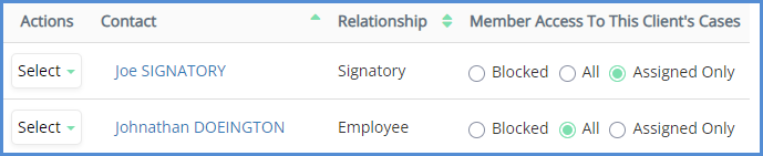- In the members list, you will see a column labeled Member Access To This Client's Cases. They can be set to blocked, all, or assigned only.
