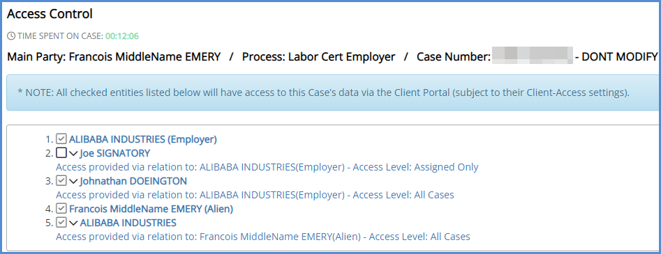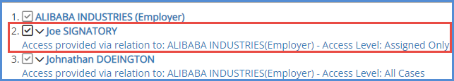 - The party that is set as Assigned Only (show in step 6), appears on this list because they are set as ASSIGNED ONLY for which the given employer is linked. However, since the party is not checked off, and they do not have access to this case (via the client portal) yet, because they haven't been assigned to it. Once the party is checked off, they will have access to this case via the client portal.