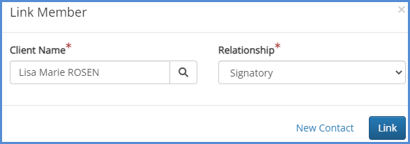 - Search for the contact, or click the New Contact button. Once you've set up your contact, set the relationship to Signatory and click the Link button.