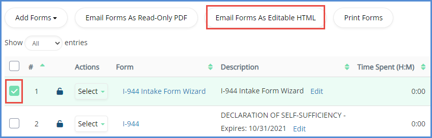 - Check the form, and choose to Email the form as Editable HTML. This will send the wizard to the client for them to review and complete.