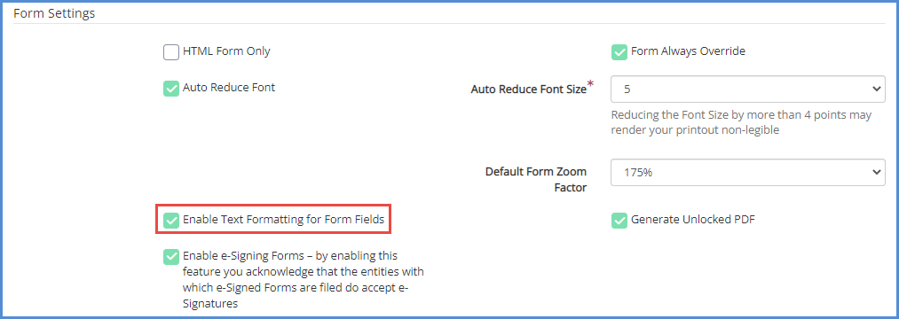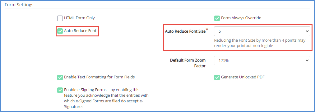 - Under Form Settings, make sure the Auto Reduce Font option is checked, and select your Auto Reduce Font Size.