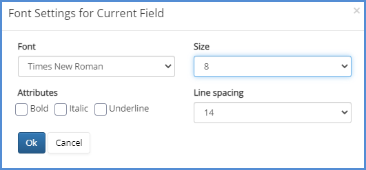 - In the pop-up, you can update the font settings for the current field by changing the font type, size, attributes, and line-spacing. Then click OK.