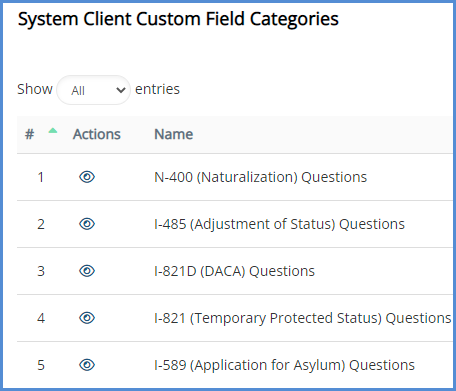 - The Categories sub-tab will show you the drop-down categories, and clicking on the view icon under the actions column will show all fields associated with said category.