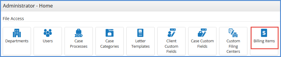 - From the administrator tools homepage, click on Billing Items. This is where you'll create your billing items that will ultimately be added as expenses to a case and then added to your invoices within the caseworker portal.