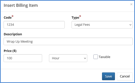 - For the Price fields, enter the cost of the billing item, choose if the item should be a flat rate or hourly, and if necessary, select the box for Taxable. For hourly, choose Hour from the drop down.