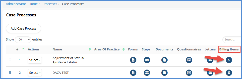 - To associate Billing Items with case processes, navigate to the Case Processes module within the Administrator Tools.