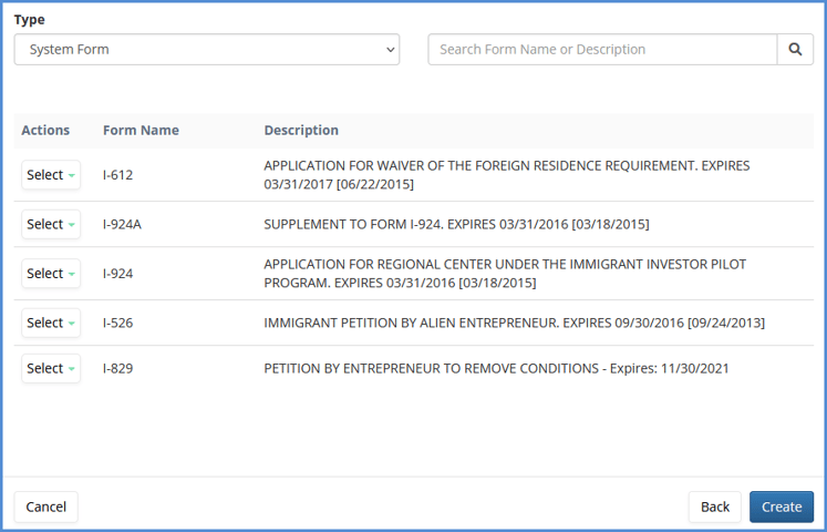 - Decide on which Forms should be added to this case. Depending on your case process settings, a specific set of forms will appear automatically. You may unlink certain forms, or you may add other forms from this page.