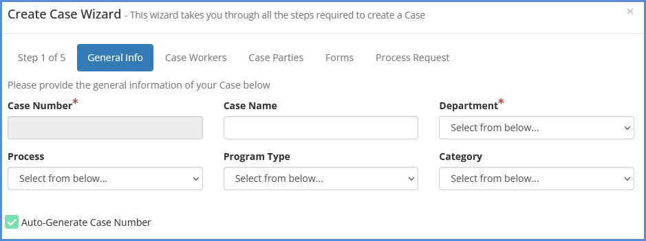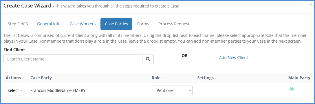 The Case Wizard is a way to create a case, link parties, determine caseworkers, as well as forms to be added to the case. It achieves the same function as creating a case through the client profile, or case module. For our case creation video, click here.