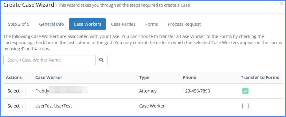 - Decide on which Case Workers should be linked to the case, as well as which Case Worker's information should transfer to the forms. Use the Add a Case Worker button to search for and add a caseworker.