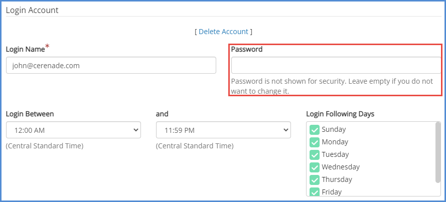 - Scroll to the login account section, and enter a password into the password field. Make sure to click the Save button.