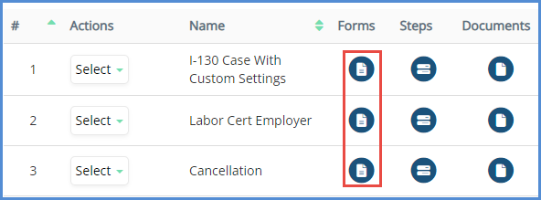 - From here, identify the case process you wish to modify the default forms for, and click the forms icon.