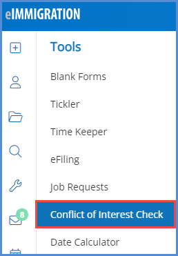- From the navigation bar, click on the Tools icon, then click Conflict of Interest Check.