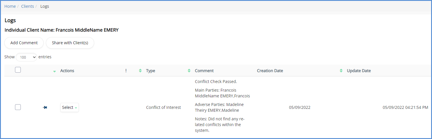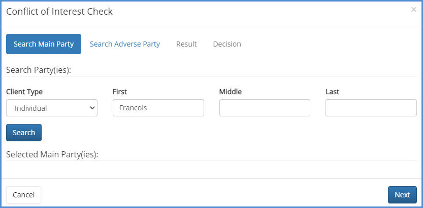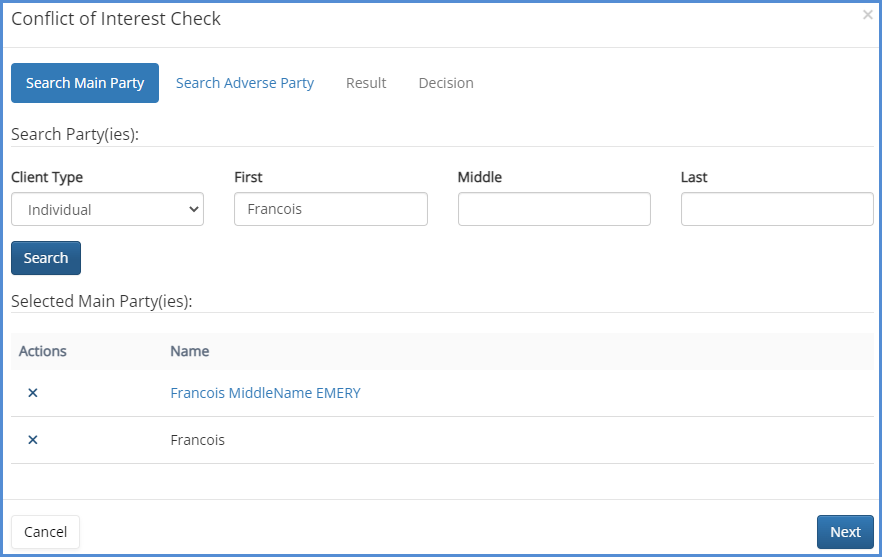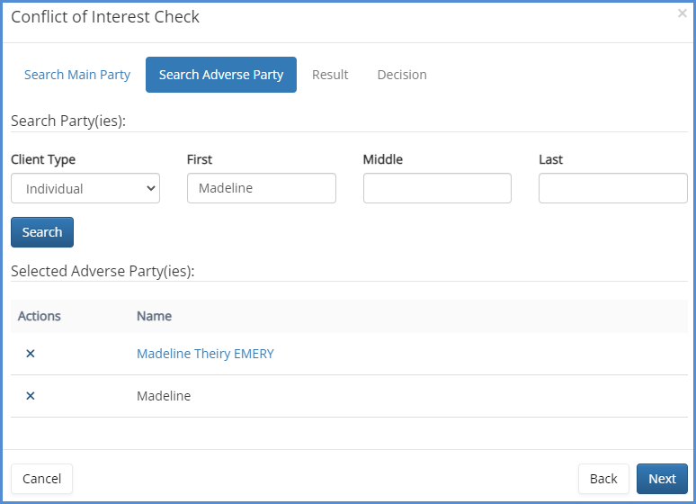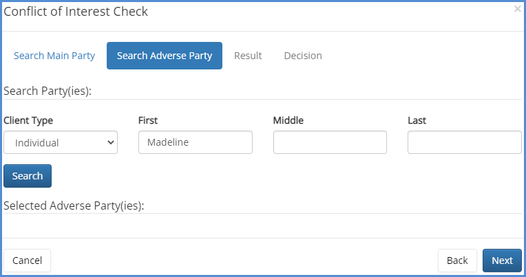 - The system will run a thorough search and will show results for any related clients, cases that may include the adverse party, along with any client/case logs that include the searched names. From here you can examine the resulting clients, cases, and logs to determine if there are any conflicts. Once you've made a decision, click Next.