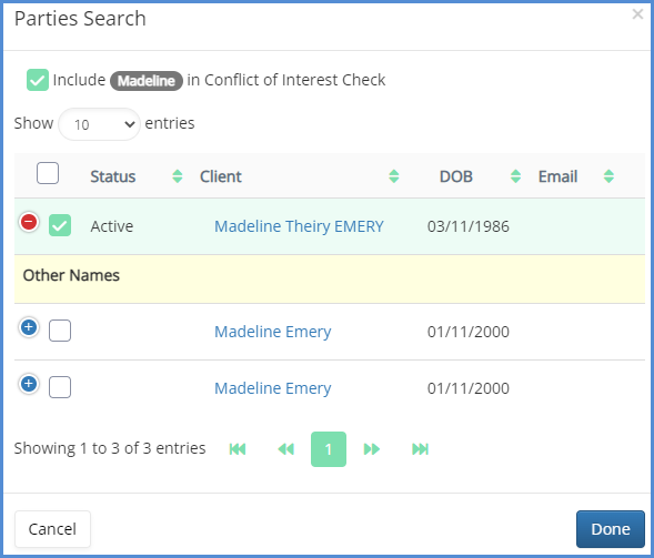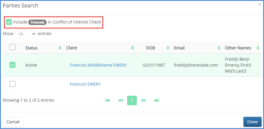 - Select the appropriate individual, and/or if necessary, also select the box to include the searched name in the conflict check (regardless of client specificity). Click Done.