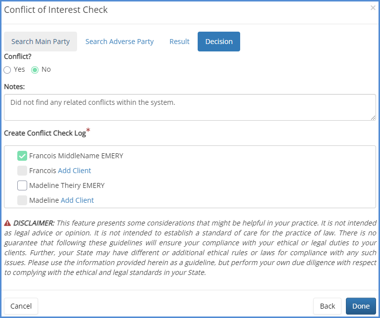 - On the Decision page, choose either yes or no for the conflict question, enter a reason for your determination, and then select the profile(s) where you'd like the conflict decision log to be added to. If this is a new client, you can click the Add Client button and a pop up will appear to take you through creating a client profile where this log will be stored. When finished, click Done.
