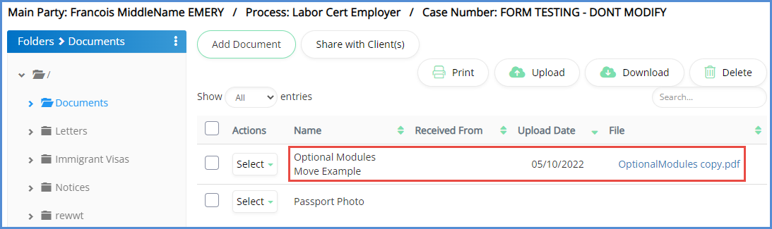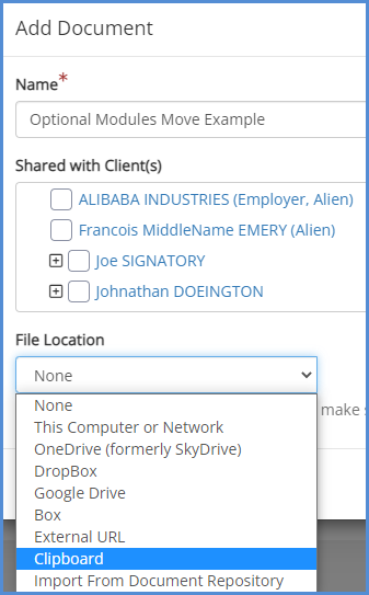 If a document is uploaded to the system and you wish to copy it to another location that accepts document uploads, the copy and paste functionality can be used. This is particularly helpful if a client uploads a document to their client profile, and you wish to copy it to the case profile for example. Note, this functionality will be available after a document has been uploaded into the system. Also note, that this is a copy and paste function, if you want to remove the document from its original location, you must go back and do so manually.