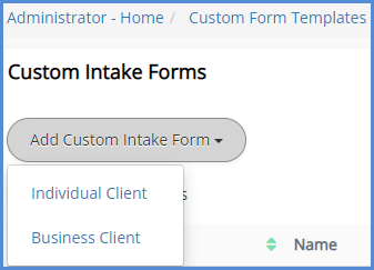 Using the Add Custom Intake Form button, select if this intake form being created is for an Individual Client or a Business Client. For our example, we'll be creating one for an Individual Client.
