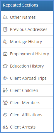 Repeated Sections - Here, you can add items that a contact profile can have multiple of (Marriage, Employment, Education, Children, Arrests, etc). On the intake form itself, the individual filling it out will see a single entry for the repeated item, and have the opportunity to click an add more button as many times as necessary, in order to add all items.