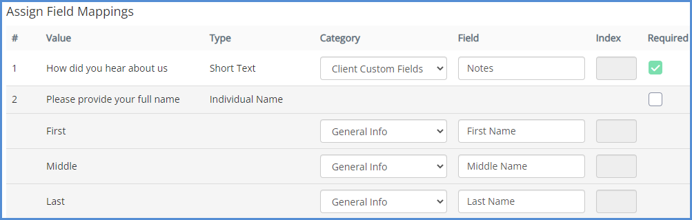 The next part of the process for creating your custom intake form is to assign field mapping. This is done so that data filled out on the intake form can be saved in the client profile, whether it be in an existing client profile field, or a custom field that was created prior to the field mapping process being done here.