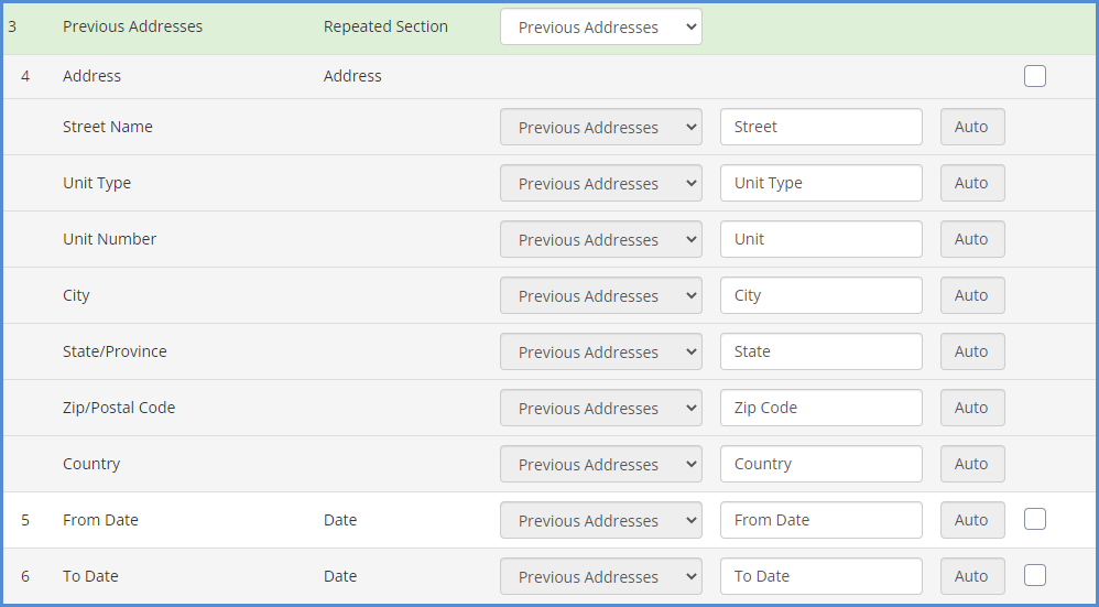 Example: For Repeated Sections, when you select the base category, the categories for the items after will be filled automatically. All that needs to be done is to map the corresponding Fields.