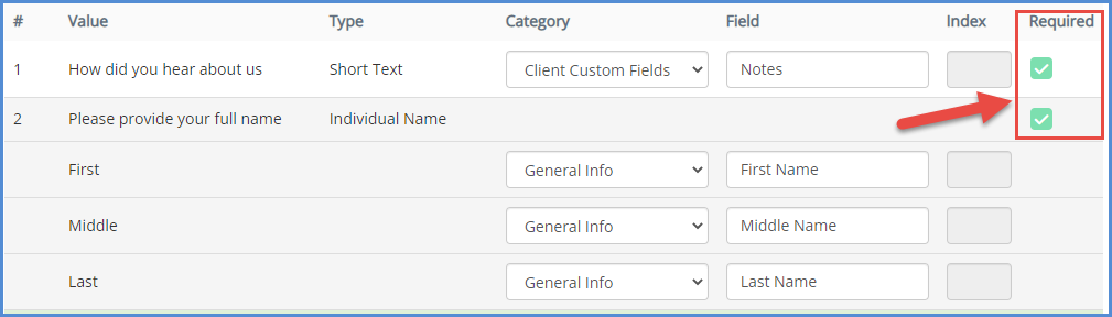 Under the Required column, choose if that field is required to be answered before submission. You can designate none, one, some, or all fields to be required.
