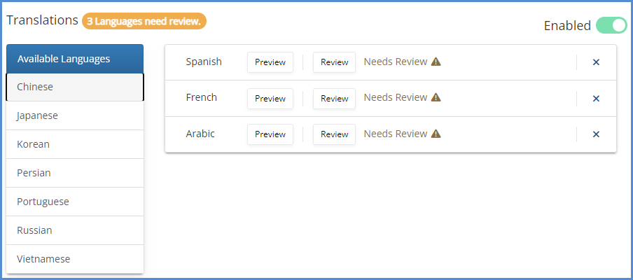 Choose the languages you'd like to include as translation options. Once a language is added, it will move from the left hand tab to the main part of the screen.