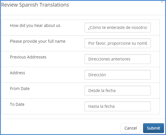 Use the Review button to review the translations for each language. eimmigration uses a translation service to auto translate each intake form item added to the form, however you still need to verify the translations are to your liking. You can change the wording of any translated item. You will need to review ALL translations before you can proceed with saving your intake form.