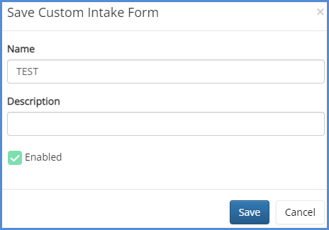 Read any additional details that may appear under the Save Form header, verify the Name and Description of your intake form, and if you want this to be available for use via the Caseworker portal, click the Enabled button. Again, click Save.
