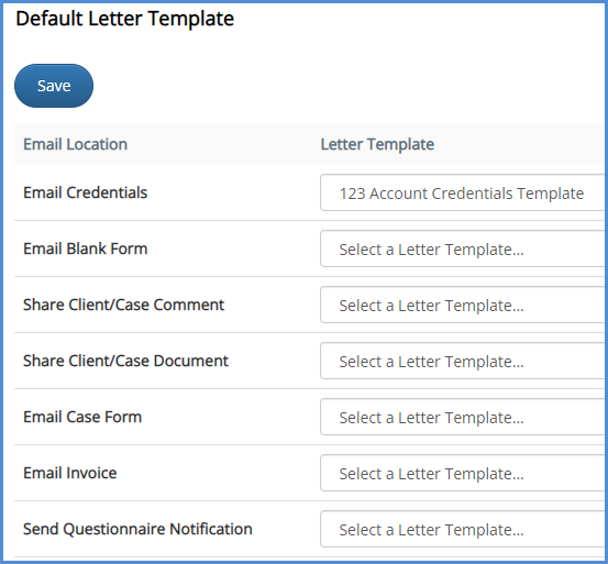 - On this page, you'll see every different area where you're able to set one of the letter templates you've created as a default letter template. An important thing to note is that if you're setting a different template as the default for Emailing Credentials you should make sure that the client credentials tags are part of the selected letter template.