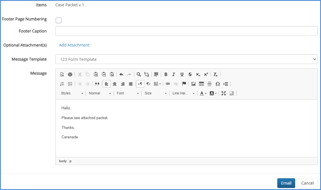 - When finished assembling your packet, you can click on the Email Document Assembly button to have the packet Emailed to the preferred recipient. Note that because packet sizes can theoretically be quite large, we do not allow for instant downloading. On the Email page, you also have the options to include a footer, and include additional attachments.