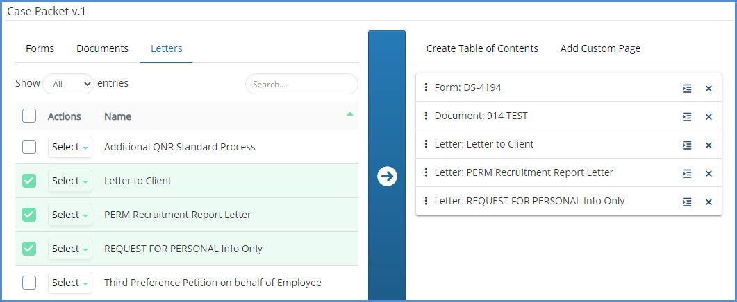 - After the document assembly has been created, you can select the different Forms, Documents, and Letters that should be part of the case packet. To add an item to the case packet, check the corresponding box, and then click the arrow button at the center of the page.
