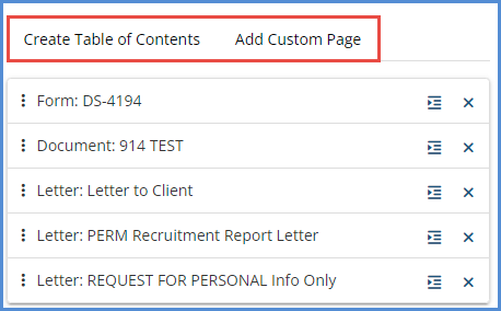 - You're also able to create a Table of Contents or add a Custom blank page, using the buttons at the top of the right column. You can also drag the packet items in order to reorder them as you'd like.