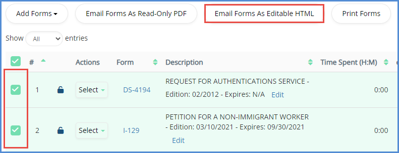 - Select the forms you wish to have edited/reviewed by the client, and click on “Email Forms As Editable HTML”.