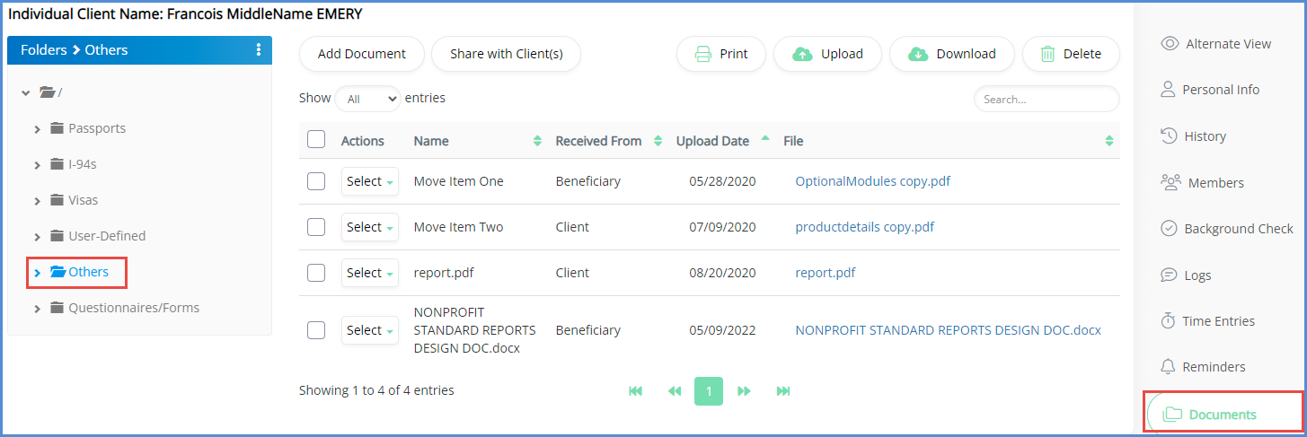 - Once the contact profile has been opened, click on the Documents tab, then click the folder where you'd like to upload the document to.