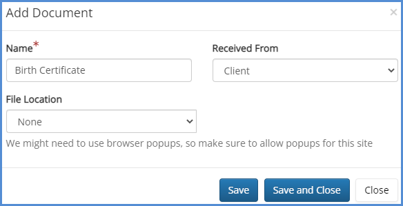 - Once the file has been uploaded, you can click Save to save the document to the system and proceed to adding another document. Or, if this is the only document you need to upload, you can click Save and Close. If you click Close without clicking Save or Save and Close, you will cancel the upload.