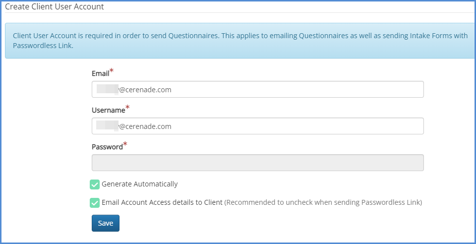 3. Enter in the contact's Username and decide whether or not to have the password generated automatically. When ready, click Save.