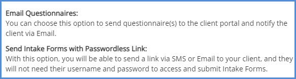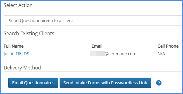 5. Next, choose your Delivery Method. You're able to either Email Questionnaires to your client, or, Send Intake Forms with Passwordless Link. For the purposes of this article, click Email Questionnaires.