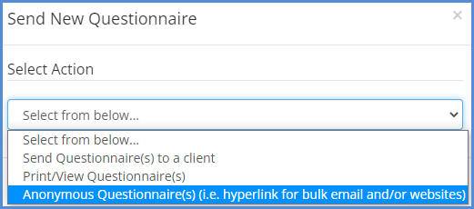 4. A link will be generated for the Anonymous Questionnaire. From here, you can use the Email icon () to Email the link, or you can copy the hyperlink and post it on a website or send it via your own Email provider. When the user clicks on the hyperlink, they will be able to complete the questionnaire and submit it.
