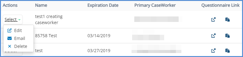 3. Complete the page by entering a Name for the Anonymous Questionnaire, Client Status, Exp. Date, assigned Caseworker, Questionnaire Pages, and Email message. When ready, click Save.
