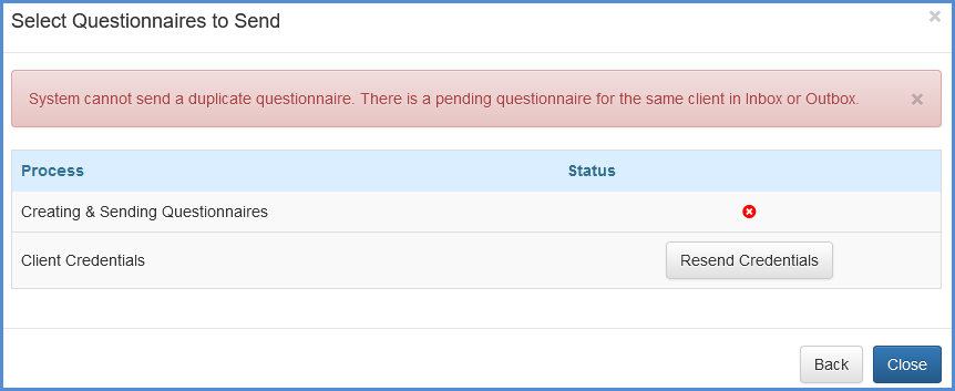 4. Note that if you select a questionnaire that is either already pending completion (client has access to this item), or pending acceptance (caseworker needs to accept this item via mailbox module>inbox), you'll get an error message. If you receive said error message, click the Back button, and uncheck any questionnaire that has been sent to the client already as is pending an action.