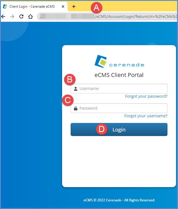 - You should have received and Email from your caseworker with access details such as URL, Username, and Password. Enter the information and click on Login.