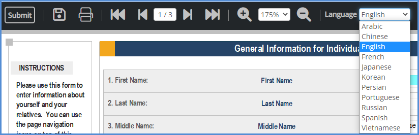 - Page Zoom - This set of buttons allow you to zoom in/out of the form.