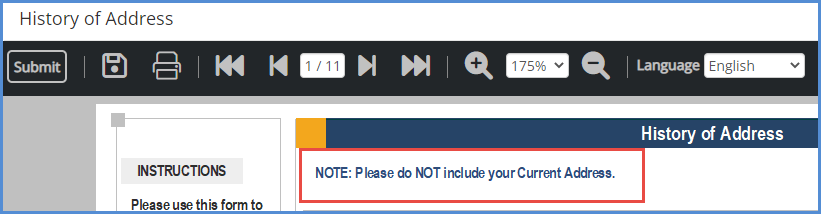 - If you need to complete the History of Address questionnaire, do not enter your actual address. This information goes under the general information for individual client questionnaire on page 3. You can add as many entries as necessary, depending on the number of years of history requested.