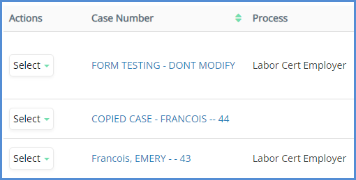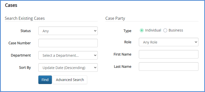 - On the Cases screen, the system allows you to search for a case by the case number, or by simply selecting the Sort By criteria and clicking Find. You may search by case party, and you may also add additional case parties to the search to narrow results even further.
