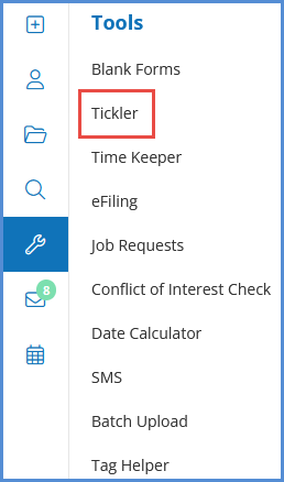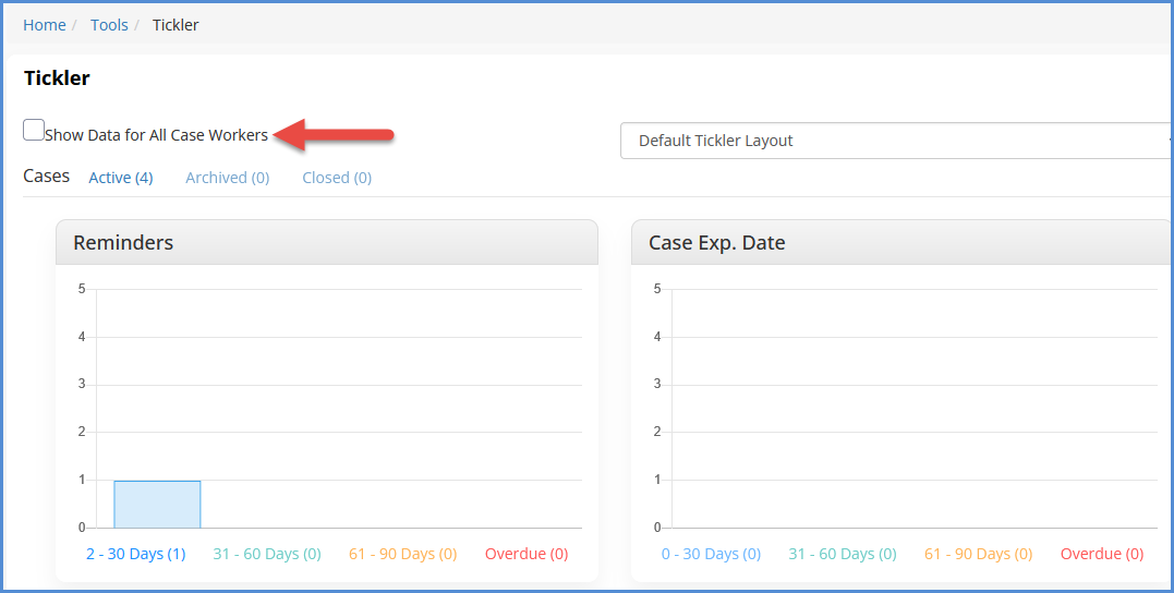 - The Tickler displays documents, process steps, and cases, ordered by their expiration date. You can also choose to view Data from ALL case workers. Finally, there is a color coded graph to provide a visual representation of all tickler items.