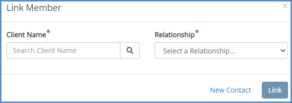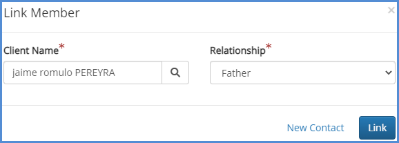 - If you would like to find a contact, type the client name and the results will appear. Click the name of the client you'd like to link, and choose the Relationship. Next, click Link.