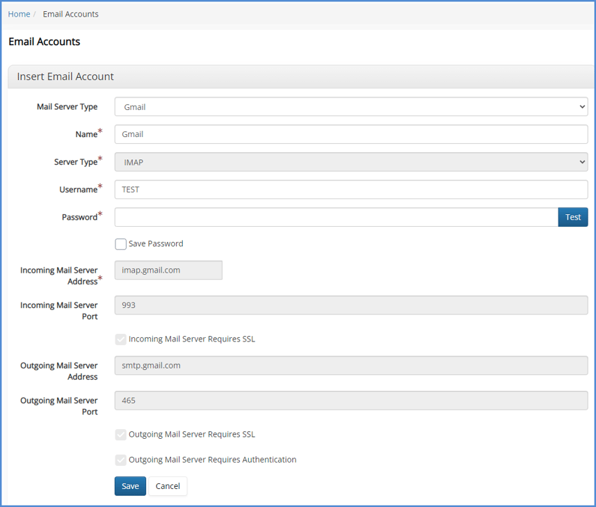 - Choose your Mail Server Type, Name, and Server Type (Once you choose a Mail Server Type, you'll be given fields where you can enter your Email username and password, and the option to click save password). Once done, click Save.