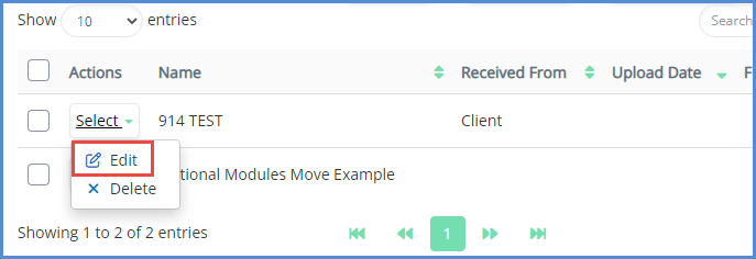 - If there is a document checklist setup for the case process that is in use, you can upload a document directly to a checklist item. Identify the document checklist item you wish to upload a file for, hover over the actions button click edit.
