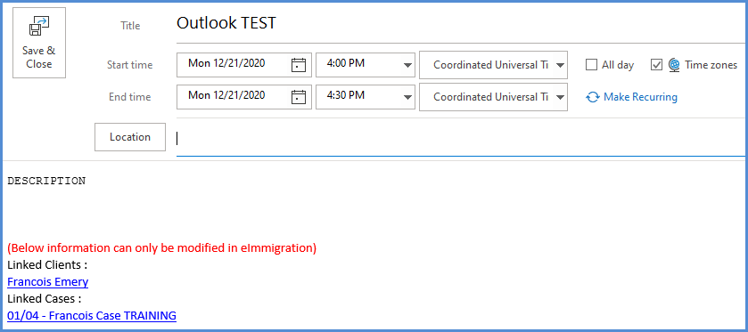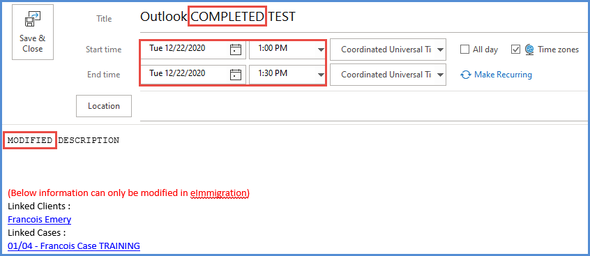 - Finally, if we modify this entry in Outlook, the changes will then appear in eimmigration.