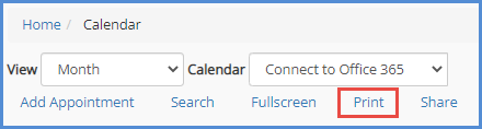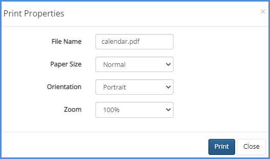 1. Print whatever calendar view you are in, in a printer friendly format, by clicking the Print button. This function will download a PDF of your calendar view to your computer.